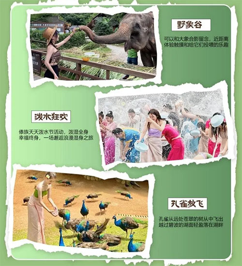 野象谷:中国唯一一处能近距离安全观测到亚洲野象的地方。在观象台,静静地等待野象的出现,感受它们的憨态可掬和强大的生命力。除了野象,野象谷还有许多珍稀的动植物,如绿孔雀、犀鸟、望天树等,让你领略到大自然的神奇与美妙; 原始森林公园:是一个充满生机与活力的地方。这里有茂密的原始森林、清澈的溪流、壮观的瀑布。漫步在林间小道,呼吸着清新的空气,感受大自然的恩赐; 打洛口岸:作为中国与缅甸的重要边境口岸,充满了浓郁的异国风情。站在口岸,一眼望去,对面就是缅甸的小镇。在这里,你可以看到两国的界碑,感受国界的庄严;