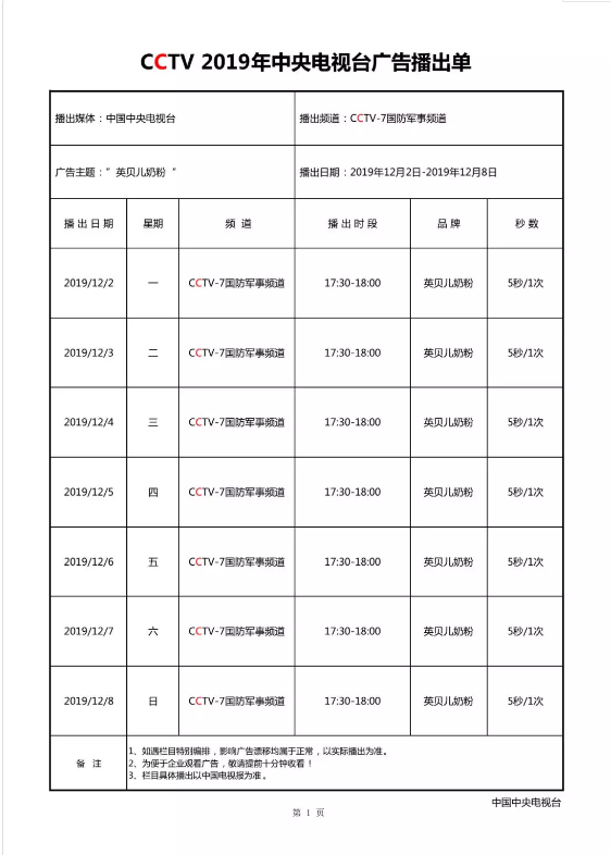 以上是本周 英贝儿奶粉播出时间表 请大家准时收看! |