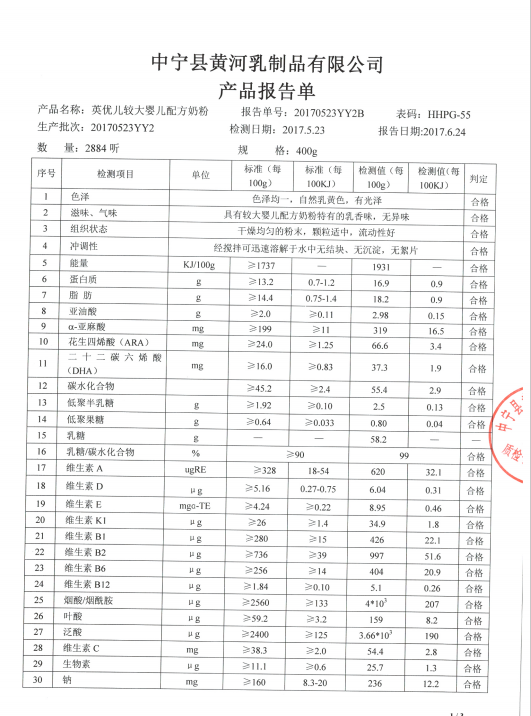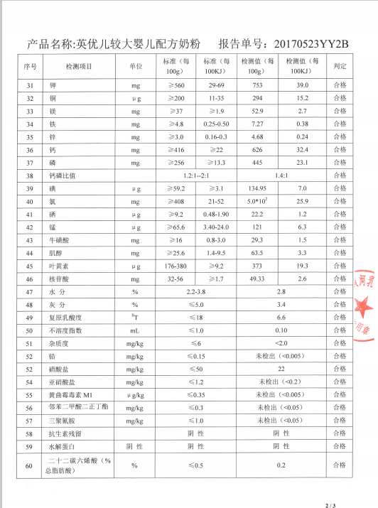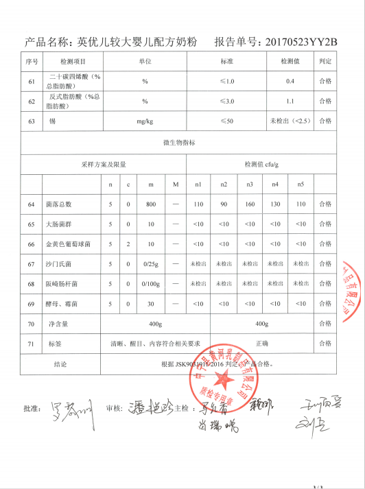 2017年5月23日英优儿牛奶粉400克2段检验报告
