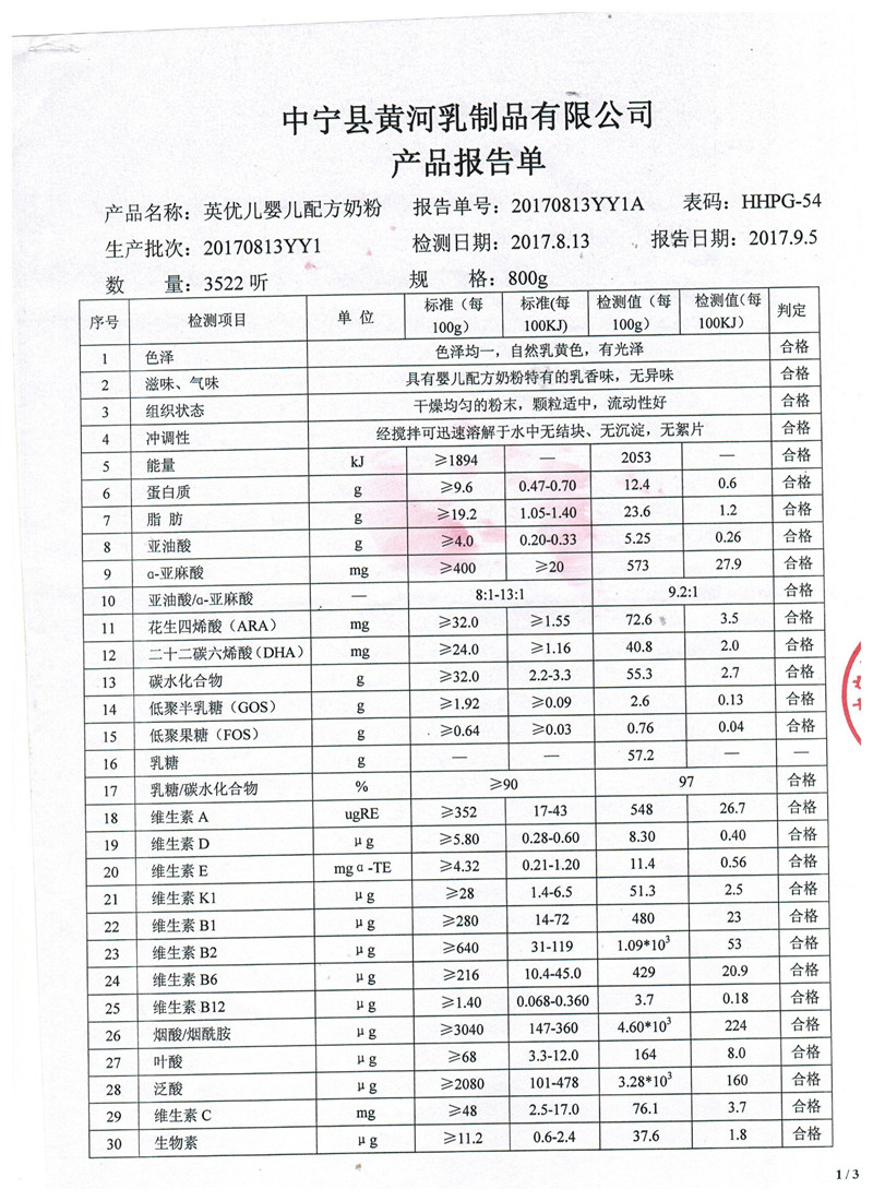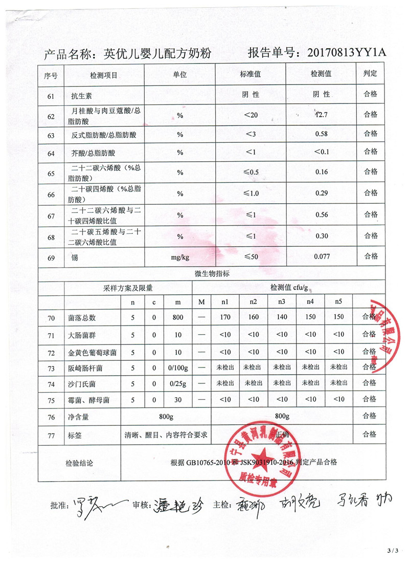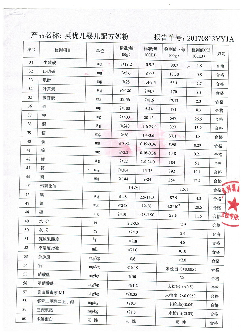 2017年8月13日英忧儿牛奶粉800克1段检验报告